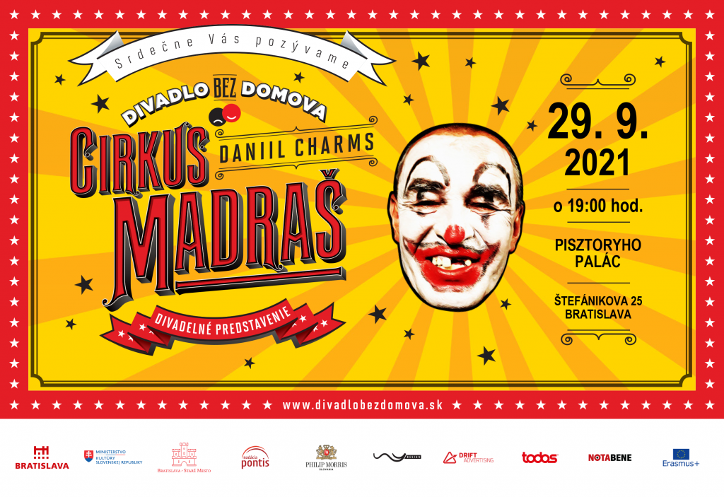 Divadlo bez domova pozýva na sledovanie divadelnej hry Daniila Charmsa “CIRKUS MADRAŠ”, ktorú uvedie v stredu 26. januára 2022 o 19:00 v ľavom krídle Pisztoryho paláca na Štefánikovej 25 v Bratislave.