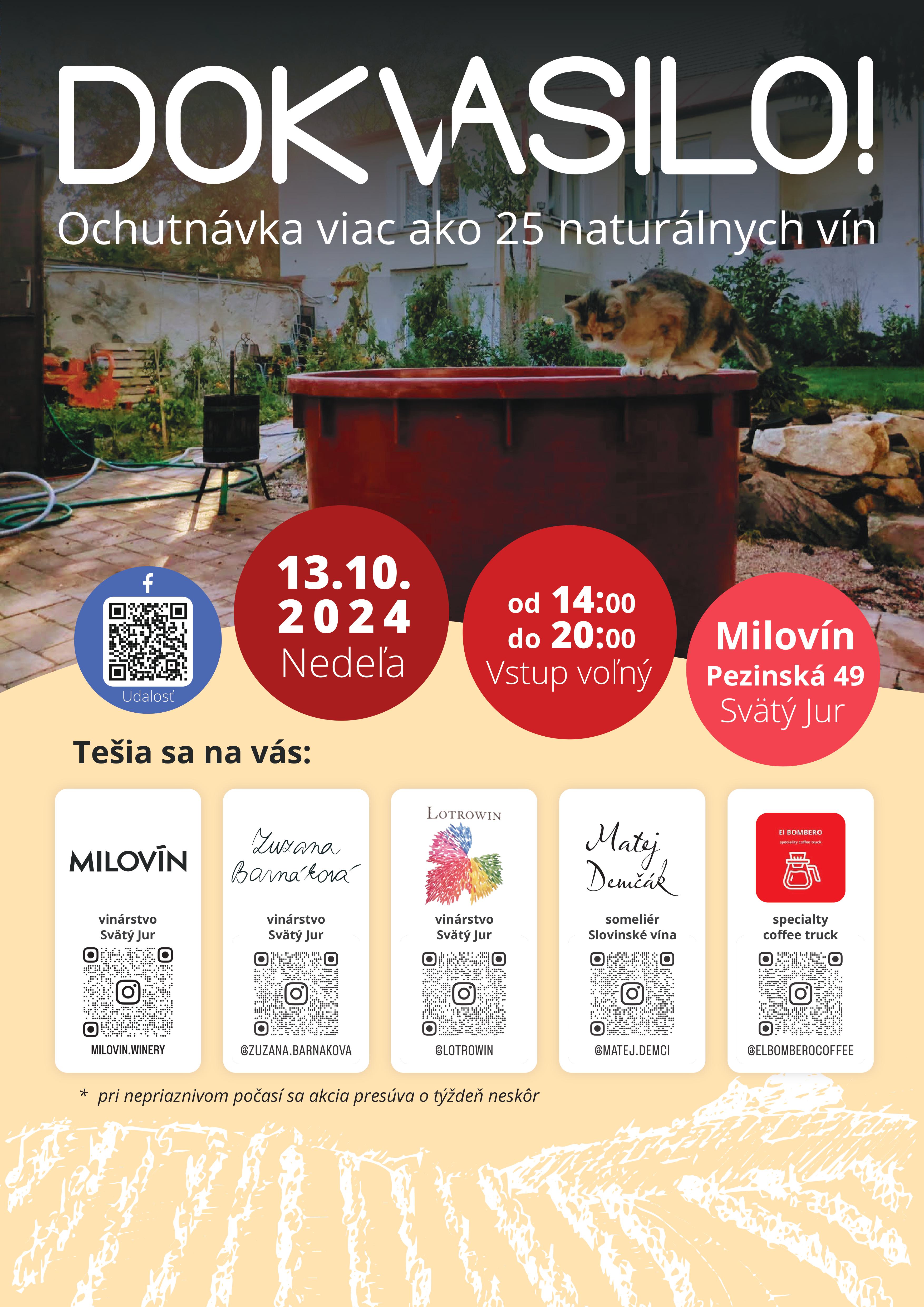 V prípade nepriaznivého počasia sa akcia presunie o týždeň neskôr na nedeľu 20. 10. 2024 Tešia sa na vás vinárstva Milovín, Zuzana Barnáková a Lotrowin.