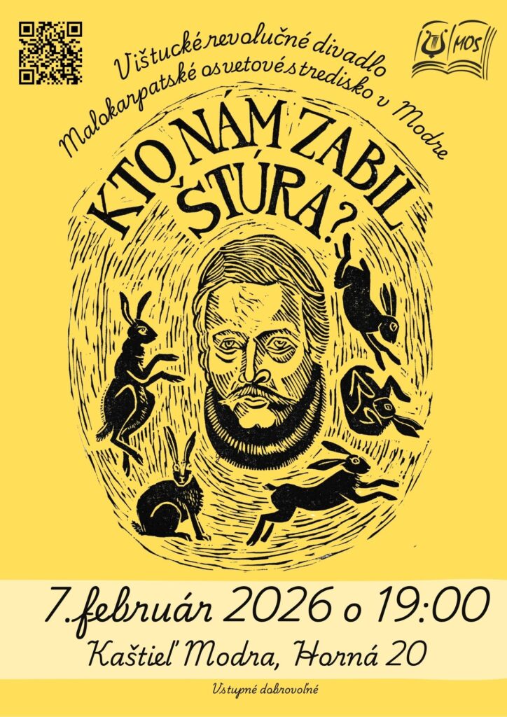 Pozývame priaznivcov ochotníckeho divadla na hru „Kto nám zabil Štúra? Pravda alebo mýtus“, ktoré si pre Vaše pobavenie a poučenie pripravilo Vištucké revolučné divadlo a Malokarpatské osvetové stredisko v Modre. Čaká Vás odhalenie nových faktov a poznatkov o živote nášho velikána a plot twist, aký ste určite nečakali. Miesto konania: sála Kaštieľa Modra. Vstupné je dobrovoľné.