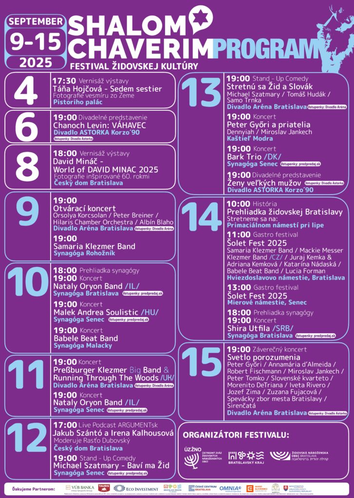 Od 9. do 15. septembra 2025 sa na území Bratislavského kraja opäť rozoznie a rozžiari Festival židovskej kultúry Shalom Chaverim, ktorý vstupuje do svojho druhého ročníka. Aj tento rok prinesie bohatý program, ktorý má za cieľ priblížiť rozmanitosť a hĺbku židovskej kultúry širokému spektru publika.