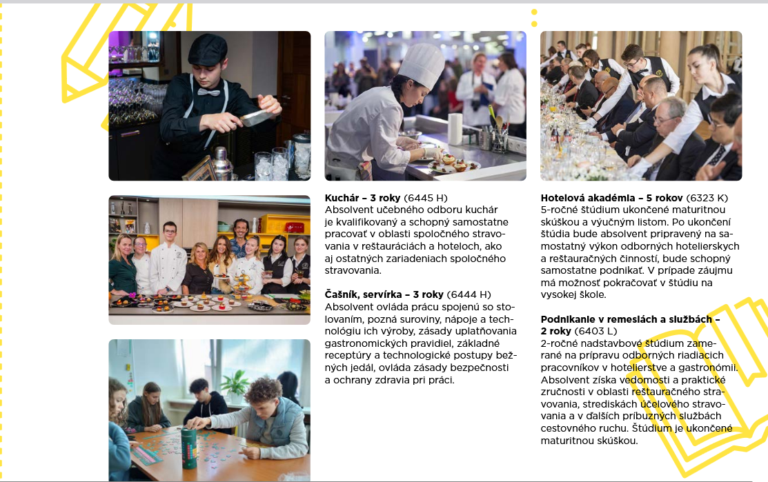 - Hotelová akadémia (5 rokov): Maturitné štúdium s možnosťou pokračovania na vysokej škole.