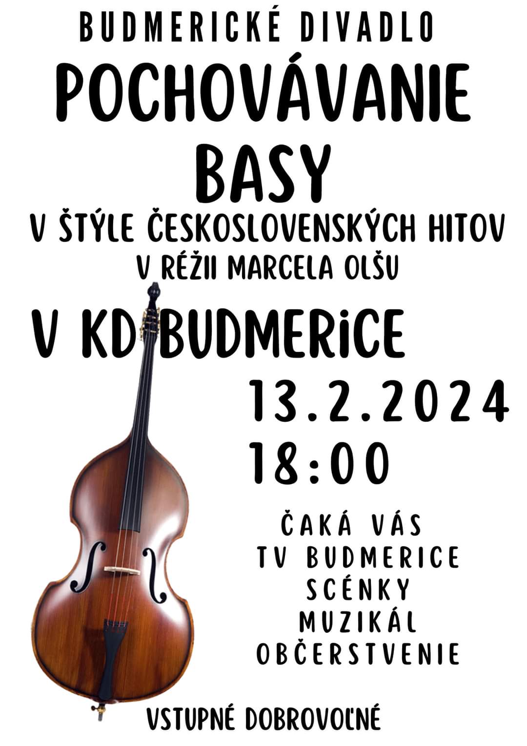Budmerické divadlo v spolupráci s Jednotným divadelným spolkom (JDS) Budmerice vás srdečne pozývajú na nezabudnuteľný zážitok. Pripravte sa na komediálny muzikál s názvom „Pochovávanie basy v štýle československých hitov“, ktorý sľubuje smiech a radostné okamihy.