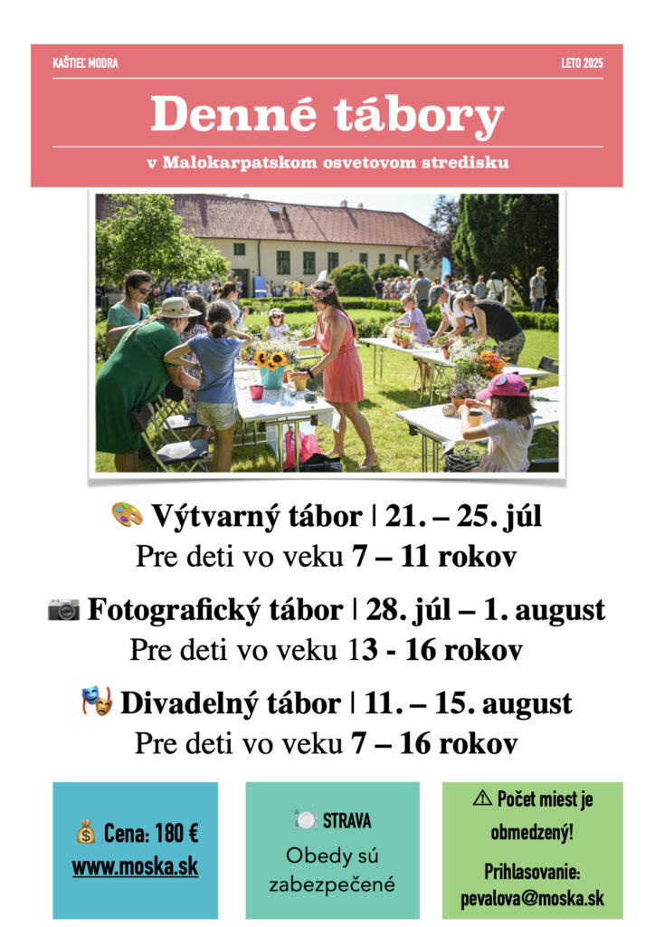 Každý tábor prebieha v bezpečnom a inšpiratívnom prostredí modranského kaštieľa, v príjemnej atmosfére a pod vedením skúsených odborníkov. Cena za každý tábor je 180 eur.