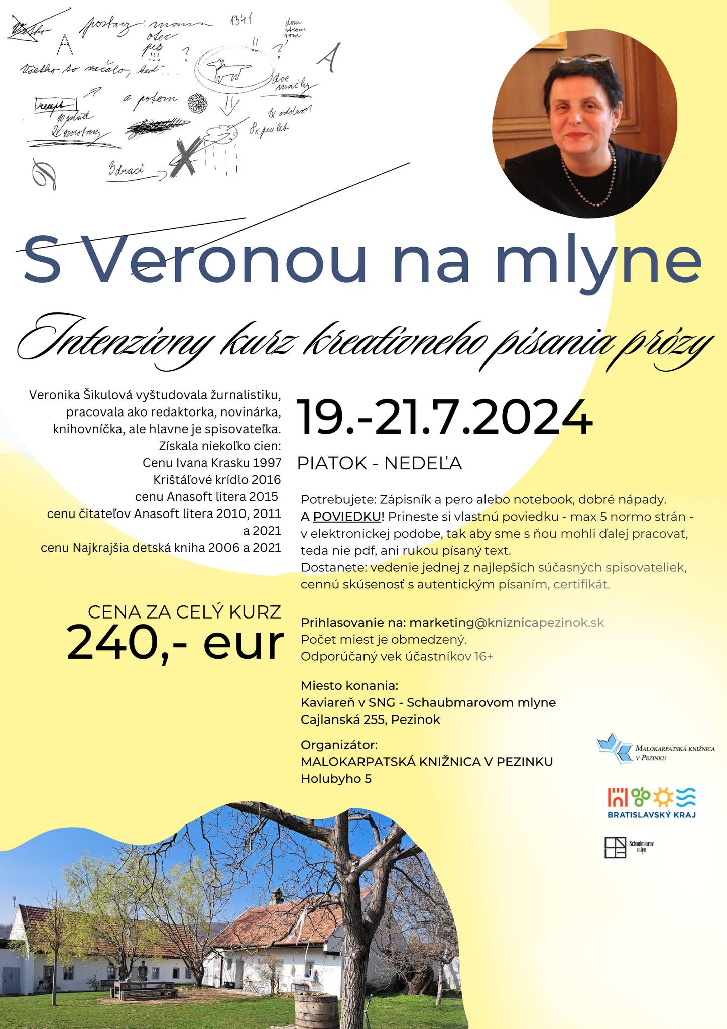 Malokarpatská knižnica v Pezinku vás srdečne pozýva na intenzívny kurz kreatívneho písania s Veronikou Šikulovou, ktorý sa uskutoční v dňoch 19. – 21. júla 2024 v Kaviarni v SNG – Schaubmarovom mlyne v Pezinku.
