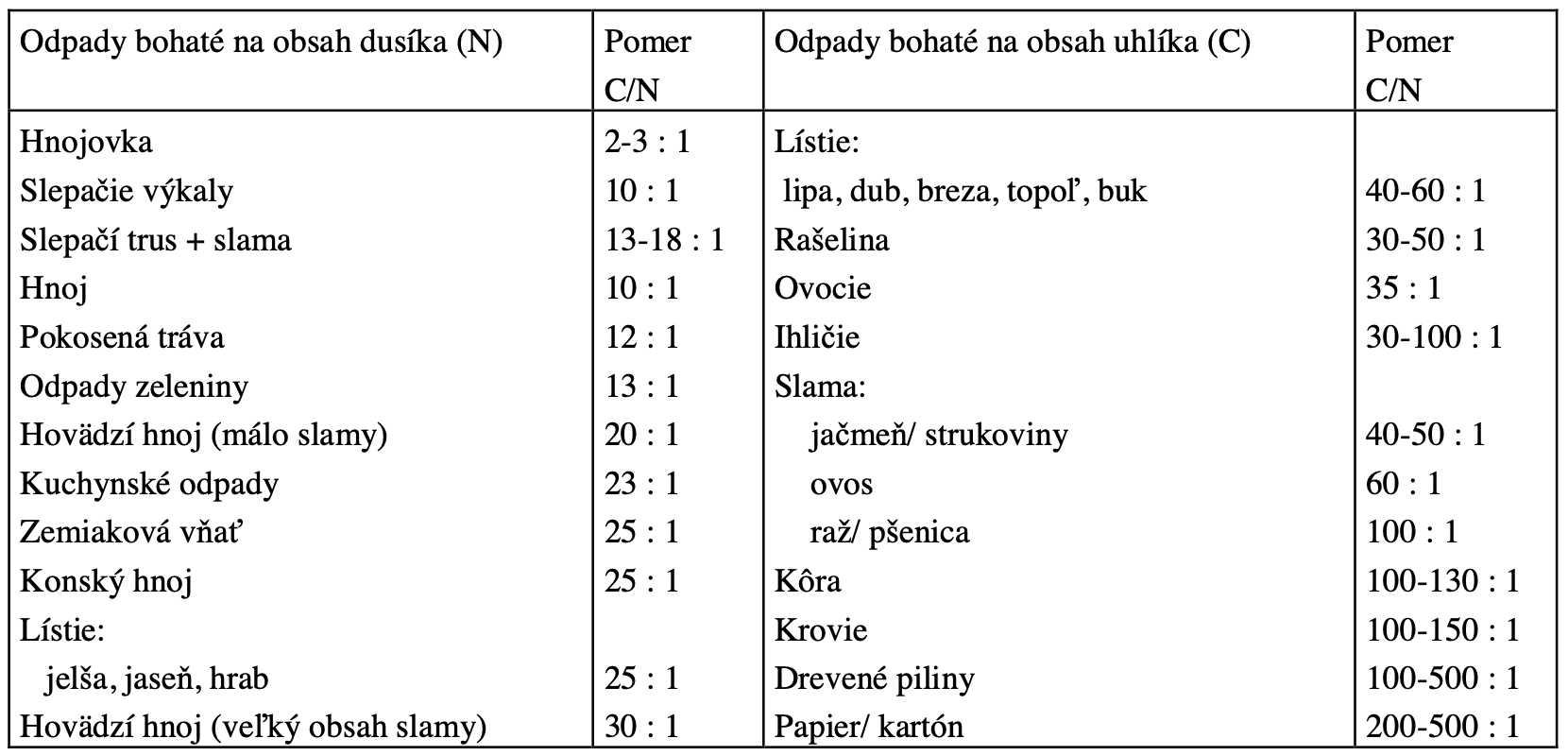 Pre jednoduchšiu orientáciu pri miešaní správneho pomeru C/N je priložená tabuľka. V prípade, že premiešame tri diely látok bohatých na obsah dusíka s jedným dielom látok bohatých na obsah uhlíka dostaneme kompost s optimálnym pomerom C/N cca 30:1.