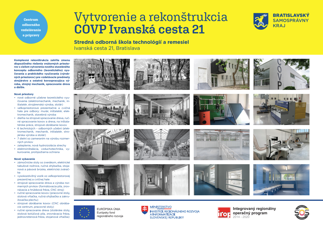 Jedným zo zrealizovaných projektov je aj komplexná rekonštrukcia Centra odborného vzdelávania a prípravy (COVP) pre stavebníctvo na Ivanskej ceste v Bratislave. Nachádza sa na Strednej odbornej škole technológií a remesiel. Slávnostne ho otvoril bratislavský župan Juraj Droba spolu so zástupcami školy, Ministerstva investícií, regionálneho rozvoja a informatizácie, zhotoviteľa, zamestnávateľov, ako aj partnerov.