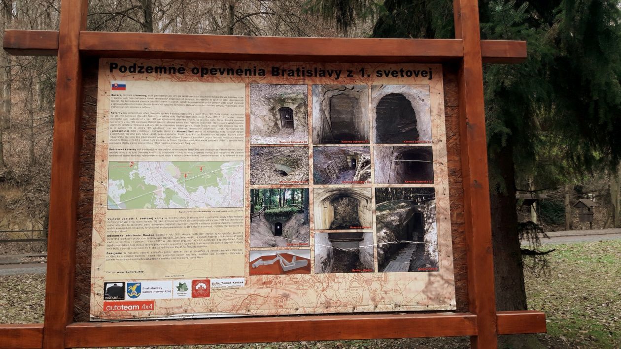 Bývalé delostrelecké betónové podzemné kryty a sklady munície v lesoch o. i. aj v oblasti Hornej Mlynskej doliny a vrchu Kamzík v blízkom okolí trasy náučného chodníka. Boli vybudované v rokoch 1914 – 1915 na obranu jediného pevného mosta v Bratislave cez Dunaj – mosta Františka Jozefa I. –, aby ruská armáda postupujúca zo severu cez Karpaty neprenikla cez Slovensko do Rakúsko-Uhorska (do Viedne, Budapešti) či na Moravu. Kaverny boli stavané tak, aby bolo vidieť z jednej na druhú. V priamom boji využité neboli, ruské vojská boli zatlačené spať. Celkovo je kaverien v oblasti Bratislavy (Devínska Kobyla – Kamzík) viac ako tridsať, miestami sú dnes dobre viditeľné v teréne. Dobrovoľníci niektoré z nich postupne čistia a sprístupňujú verejnosti.