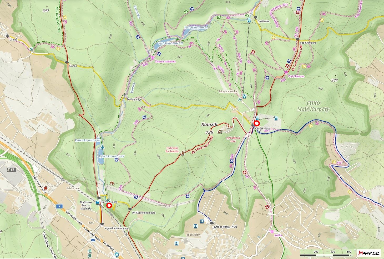 Na náučnom chodníku Červený most – Železná studienka – Kamzík sa nachádza až 18 zastávok, vedie po širokých lesných cestách a je možné naň nastúpiť na rôznych miestach – a to z rôznych zastávok autobusu MHD č. 43 v doline Vydrice, resp. z konca trasy chodníka na Kamzíku – zastávka trolejbusu MHD č. 203 Koliba a ďalej pešo 1,3 km s prevýšením 125 m po zelenej turistickej značke alebo nadväzujúcim busom MHD č. 44 (konečná – Kamzík).