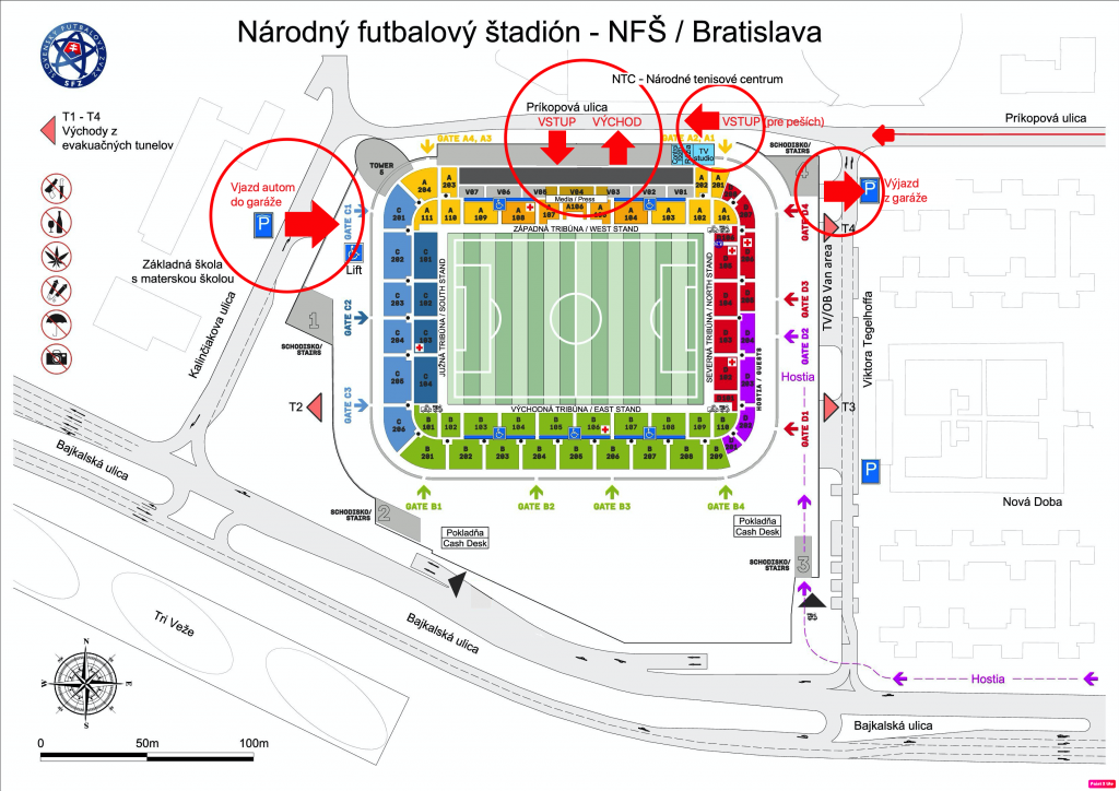 Národný futbalový štadión (NFŠ) má výbornú dopravnú dostupnosť. Ak pôjdete MHD, odporúčame električku číslo 4 (zastávka Nová doba), autobus č. 53, 75, 98 (zastávka Nová doba) alebo autobus č. 74, 78 (zastávka Bajkalská). Autom je Národný futbalový štadión prístupný z Kalinčiakovej ulice. Zaparkovať môžete v podzemnom parkovisku (kapacita 996 miest, prvá hodina je zadarmo, cena za každú ďalšiu hodinu parkovania je 1,50 €). Ak pôjdete pešo alebo na bicykli, NFŠ je prístupný z Bajkalskej ulice, z ul. Viktora Tegelhoffa, z Kalinčiakovej ulice alebo z Príkopovej ulice (popri Národnom tenisovom centre).