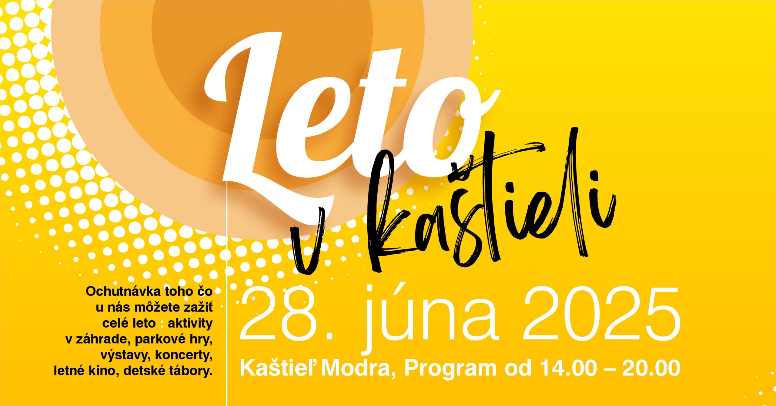 Kaštieľ v Modre opäť ožije letnou atmosférou, hudbou, divadlom a tvorivými aktivitami! V sobotu 28. júna 2025 od 14:00 do 20:00 sa uskutoční obľúbené podujatie Leto v kaštieli, ktoré prinesie bohatý program pre malých aj veľkých návštevníkov.