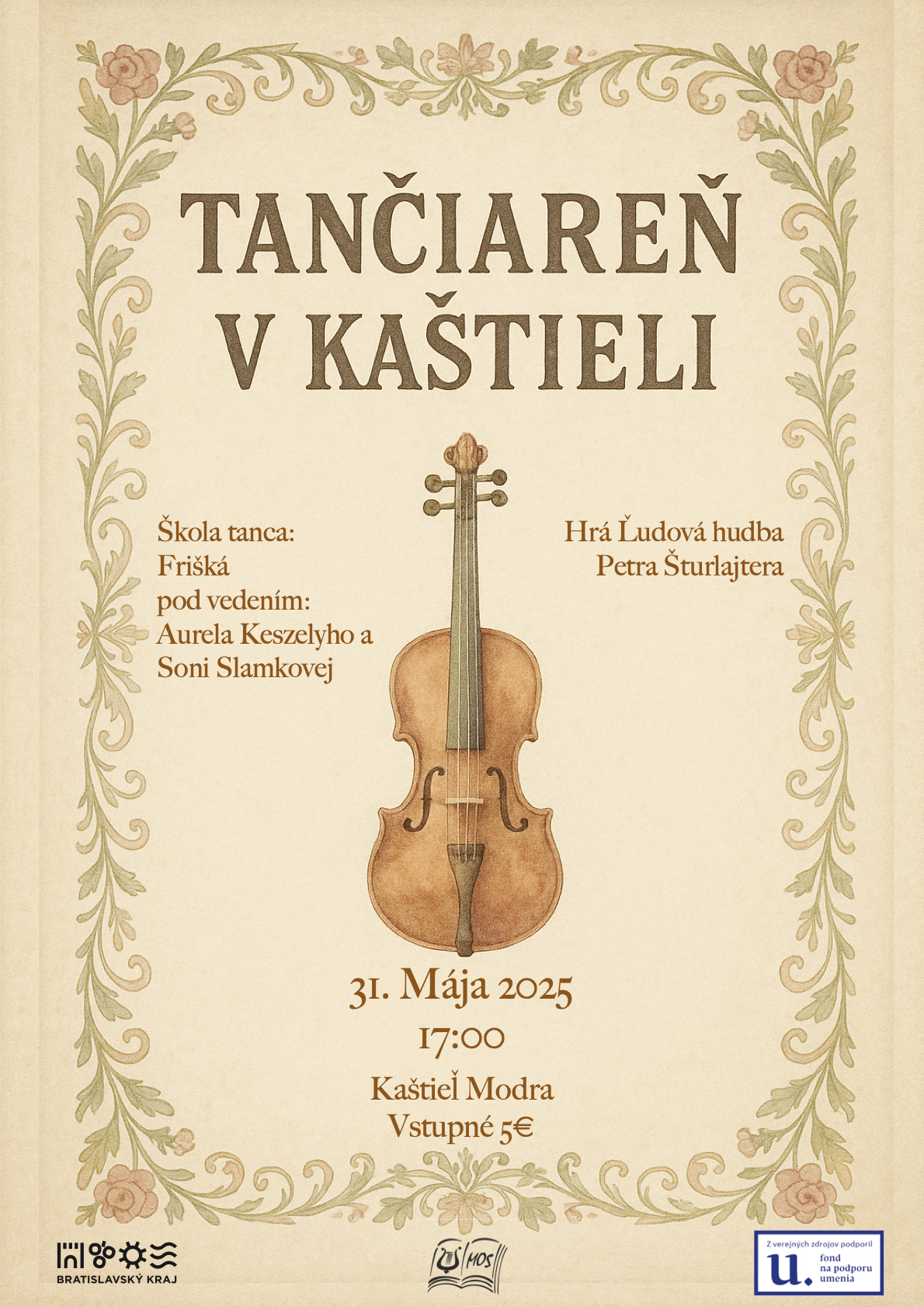 V príjemnej atmosfére kaštieľa Malokarpatského osvetového strediska vás čaká večer plný ľudovej hudby a tanca, ku ktorému nám zahrá Ľudová hudba Petra Štulrajtera.