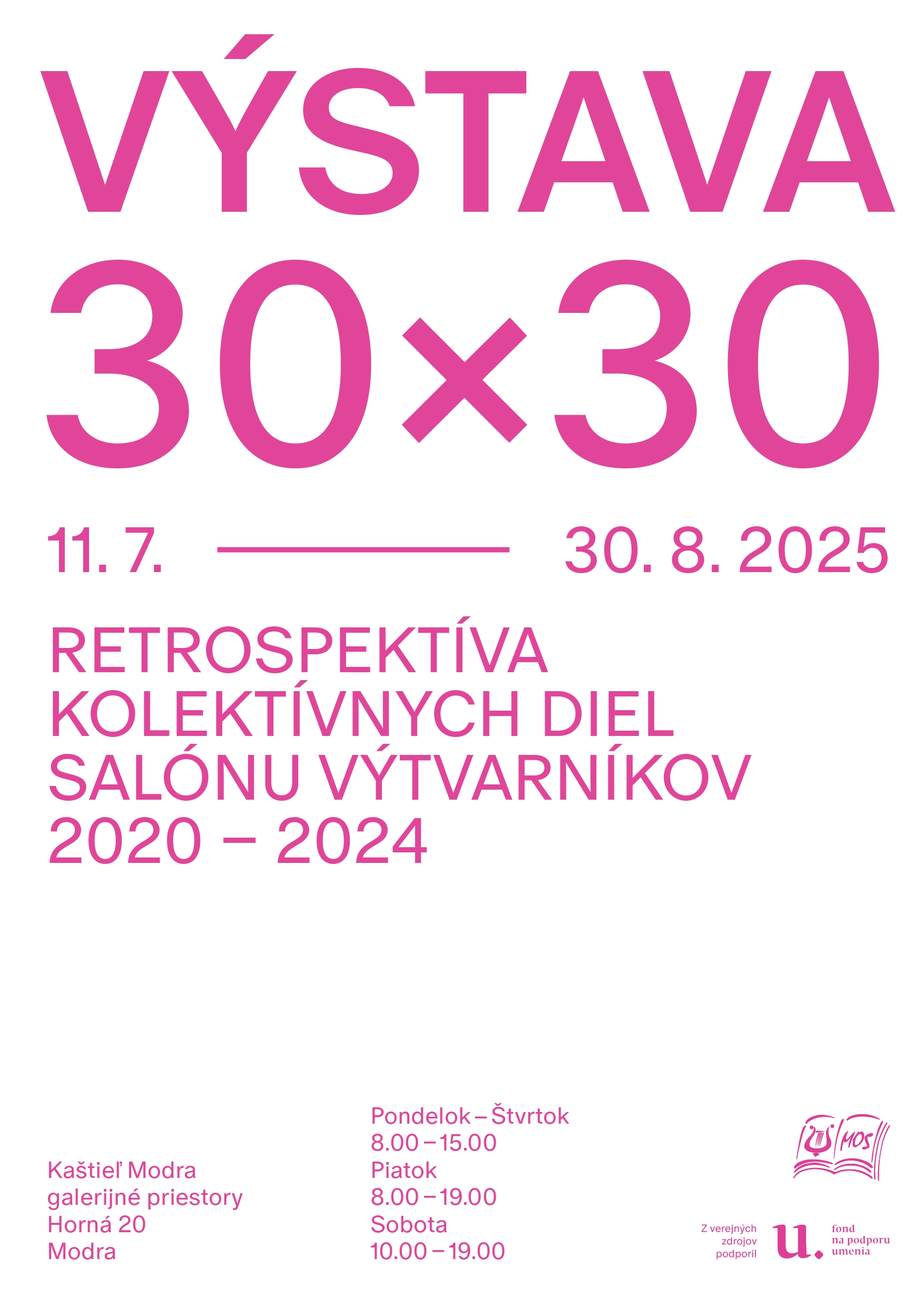 Výstava 30 × 30 – Retrospektíva kolektívnych diel Salónu výtvarníkov 2020 – 2024 prináša jedinečný pohľad na päťročnú tradíciu tvorby kolektívnych diel, ktoré vznikali ako dobrovoľná iniciatíva vystavujúcich autorov Salónu výtvarníkov. Tento projekt odštartoval v roku 2020 témou Nový život, ktorá reflektovala vtedajšiu spoločenskú i osobnú túžbu po zmene, obnove a nových začiatkoch.