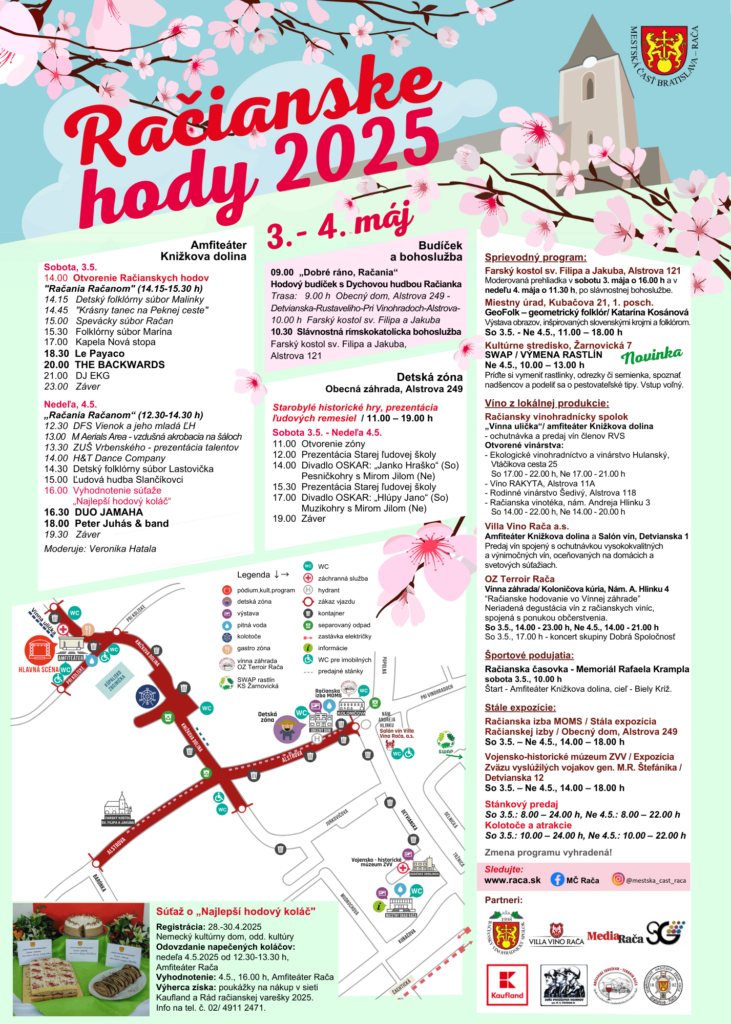 Račianske hody 2025, ktoré sa uskutočnia počas víkendu 3. a 4. mája, opäť spoja duchovné tradície, folklór, kvalitné víno, kultúru aj rodinnú zábavu. „Hody sú hlboko zakorenené v našej tradícii – sú oslavou výročia posvätenia farského kostola a sviatku jeho patrónov, sv. Filipa a Jakuba,“ pripomína farár Zdenko Sitka. Podujatie otvorí slávnostný ceremoniál v sobotu o 14.00 h v amfiteátri na Knižkovej doline. Program je zostavený tak, aby si každý – od detí až po seniorov – našiel to svoje.