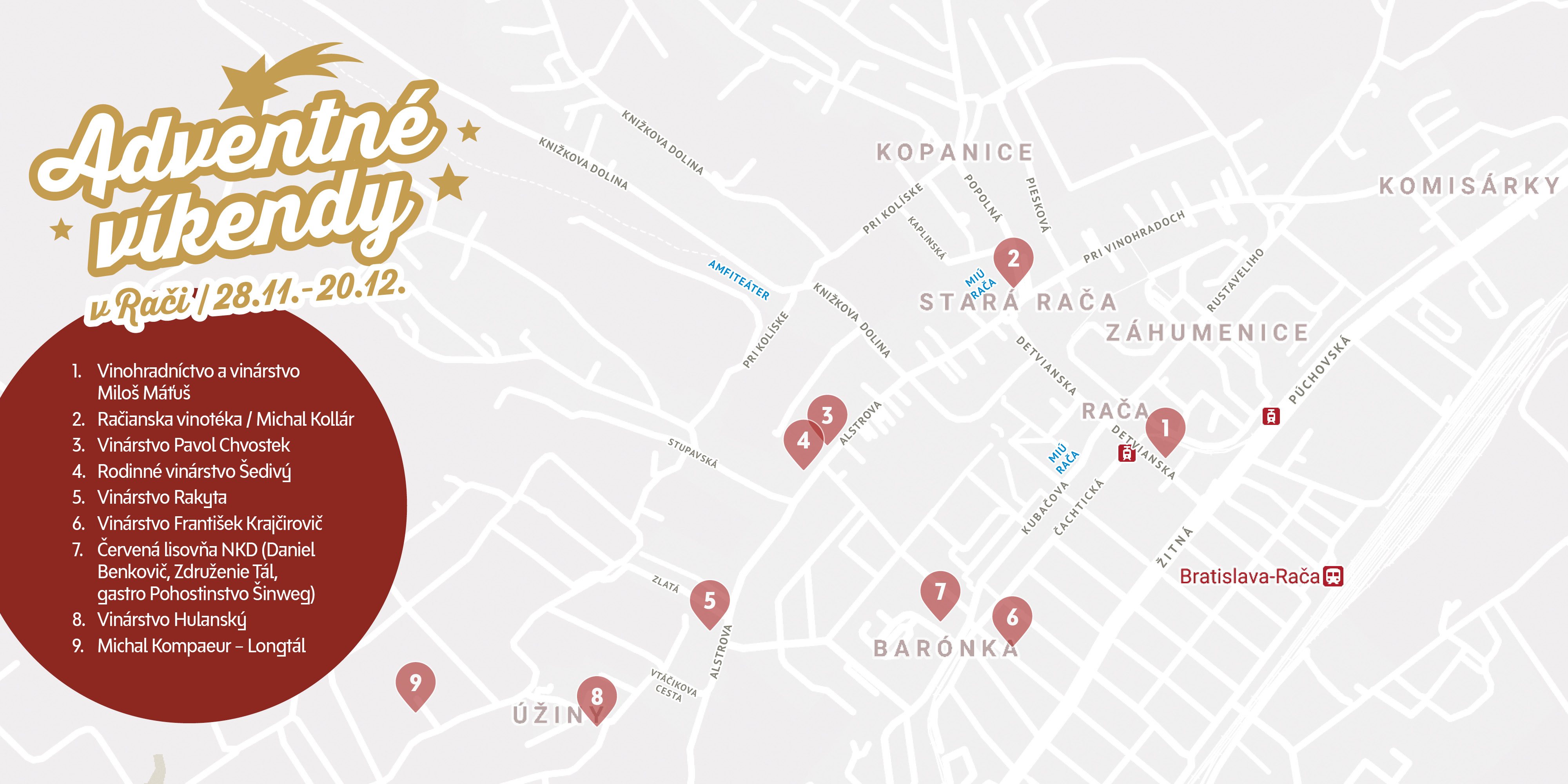 Z dôvodu aktuálnej situácie si, žiaľ, nemôžeme užiť klasické vianočné trhy. Atmosféru vám však vynahradí víkendová prechádzka po Rači so zastávkami u našich vinárov.