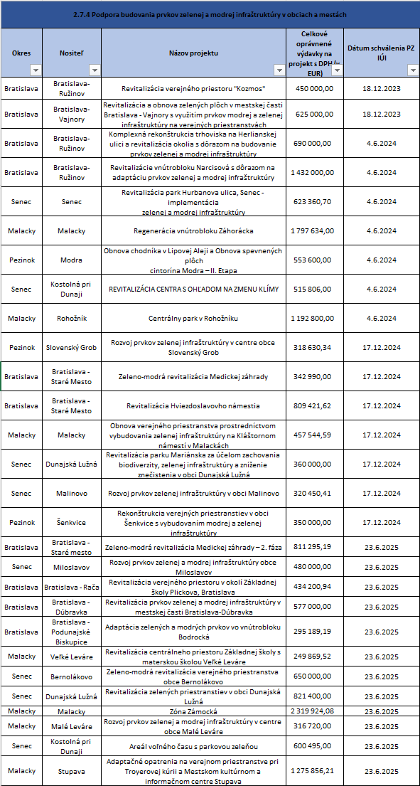 2.7.4 Podpora budovania prvkov zelenej a modrej infraštruktúry v obciach a mestách