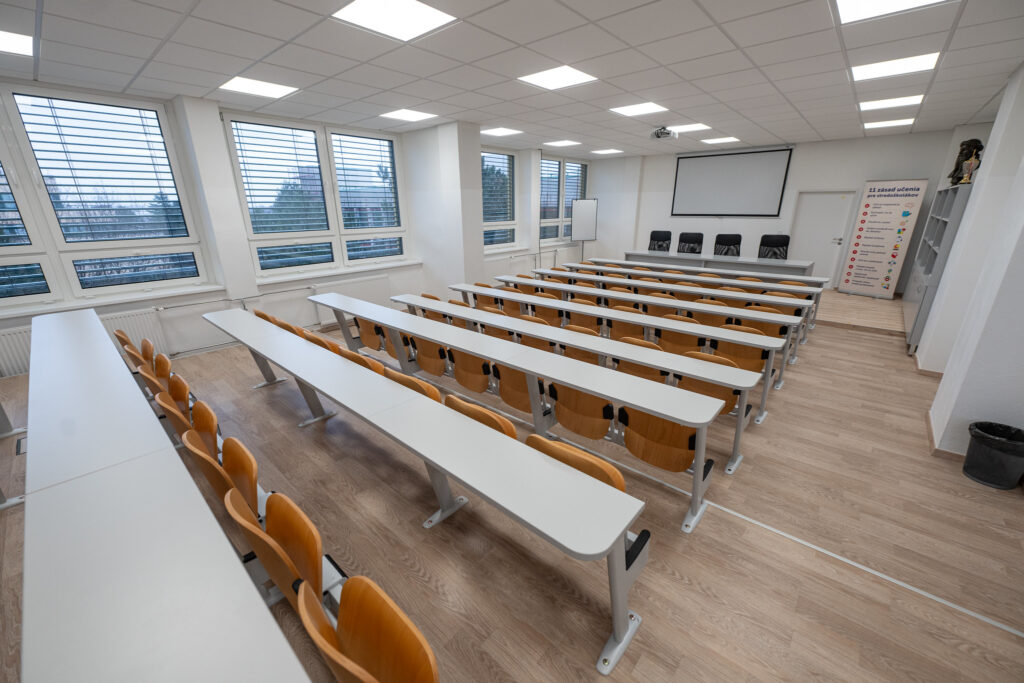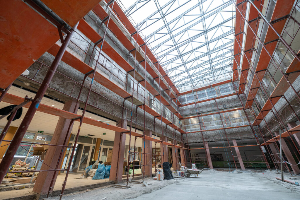 Osobitnou kapitolou druhej etapy je prestrešené átrium – nový priestor, ktorý sa má stať prirodzeným „srdcom“ areálu. Doteraz otvorený vnútorný dvor sa zmení na celoročne využiteľné miesto, ktoré prepojí časti budovy a zlepší pohyb v areáli. Prinesie viac denného svetla, lepšiu vnútornú klímu a priestor na stretávanie či školské podujatia. Okrem architektúry má aj praktický prínos – podporí energetickú hospodárnosť a dá historickému areálu súčasný charakter.
