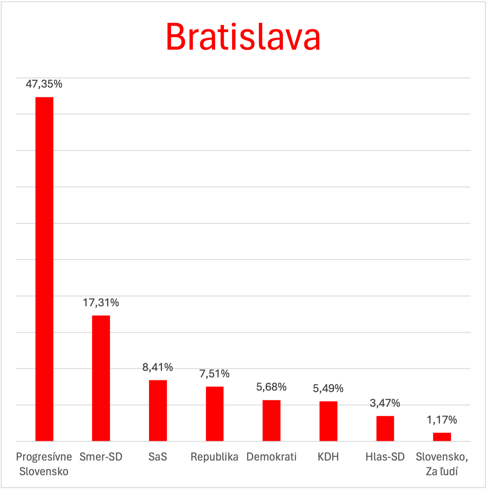 V samotnom meste Bratislava získalo Progresívne Slovensko ešte vyšší podiel hlasov – až 47,35%. Smer-SD skončil druhý s 17,31%, nasledovaný SaS s 8,41%, Republikou s 7,51%, Demokratmi s 5,68%, KDH s 5,49%, Hlas-SD s 3,47% a hnutím Slovensko, Za ľudí s 1,17%.