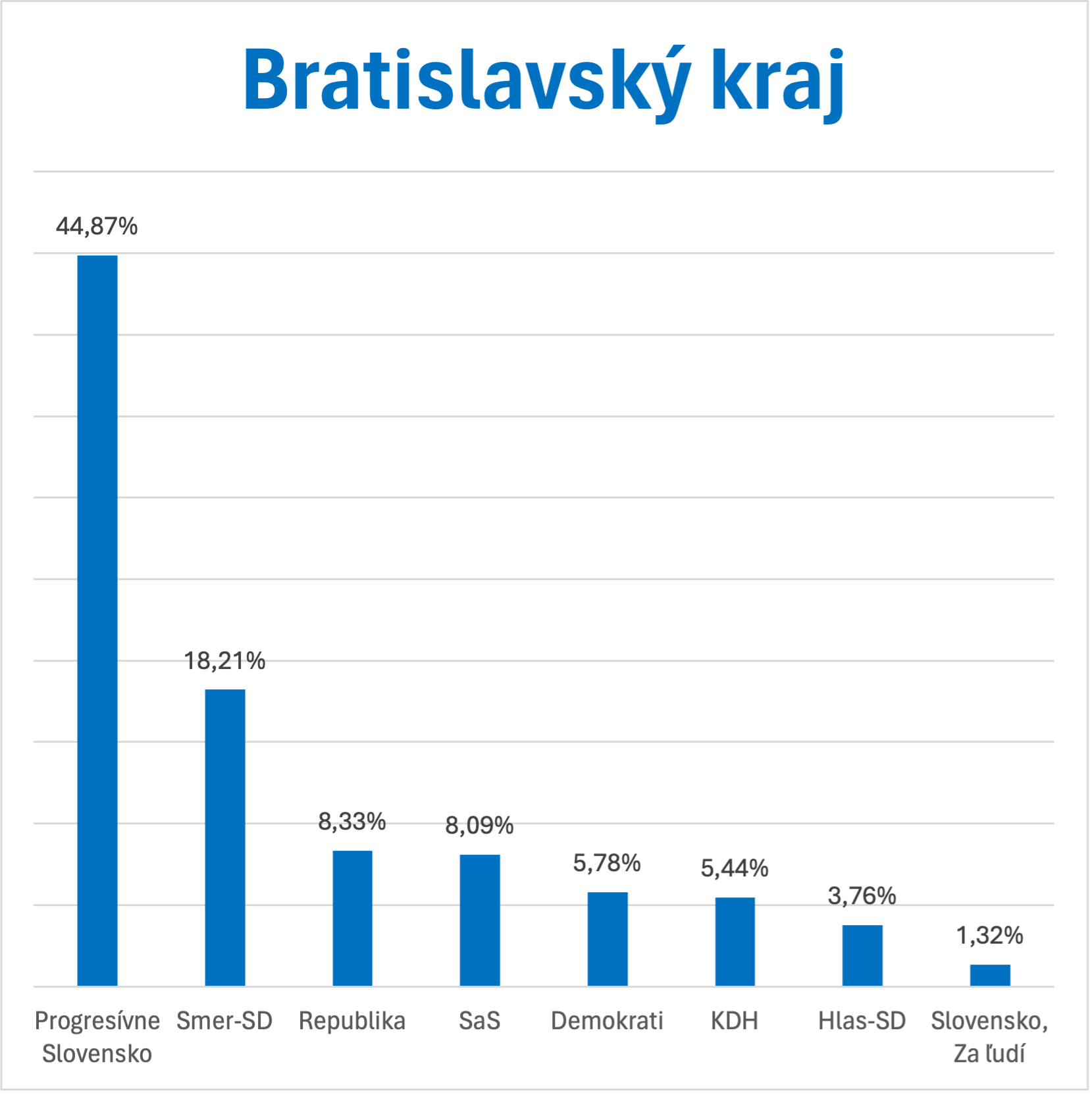 Progresívne Slovensko dominovalo v celom kraji s 44,87% hlasov. Nasledoval ho Smer-SD s 18,21%, Republika s 8,33%, SaS s 8,09%, Demokrati s 5,78%, KDH s 5,44%, Hlas-SD s 3,76% a hnutie Slovensko, Za ľudí s 1,32%.