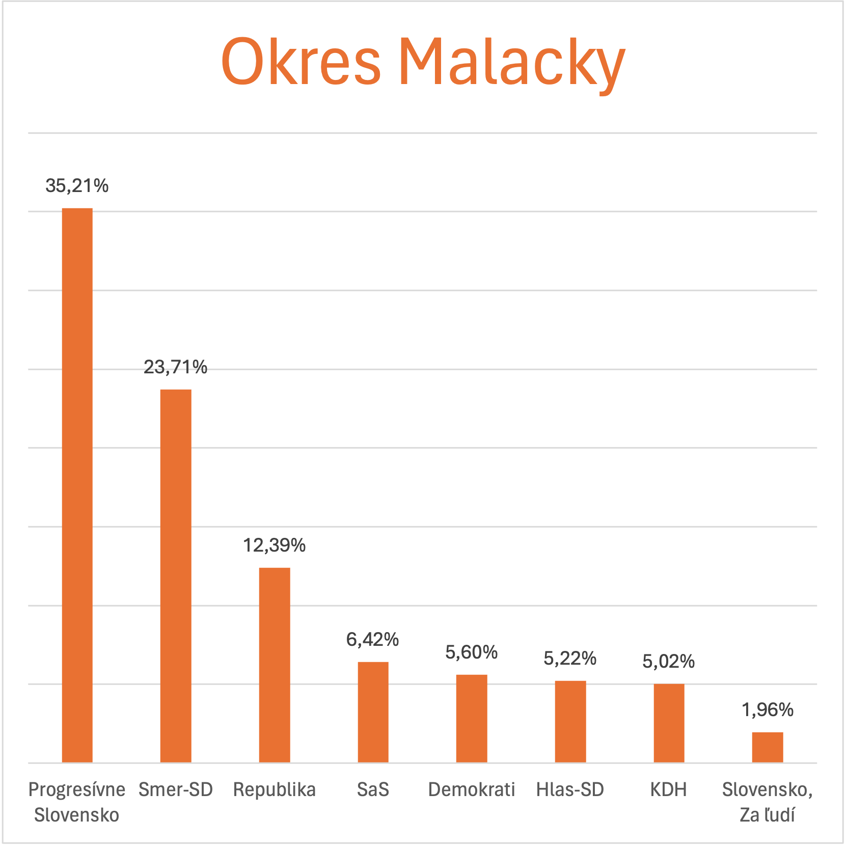 V okrese Malacky získalo Progresívne Slovensko 35,21% hlasov, Smer-SD 23,71%, Republika 12,39%, SaS 6,42%, Demokrati 5,60%, Hlas-SD 5,22%, KDH 5,02% a hnutie Slovensko, Za ľudí 1,96%.