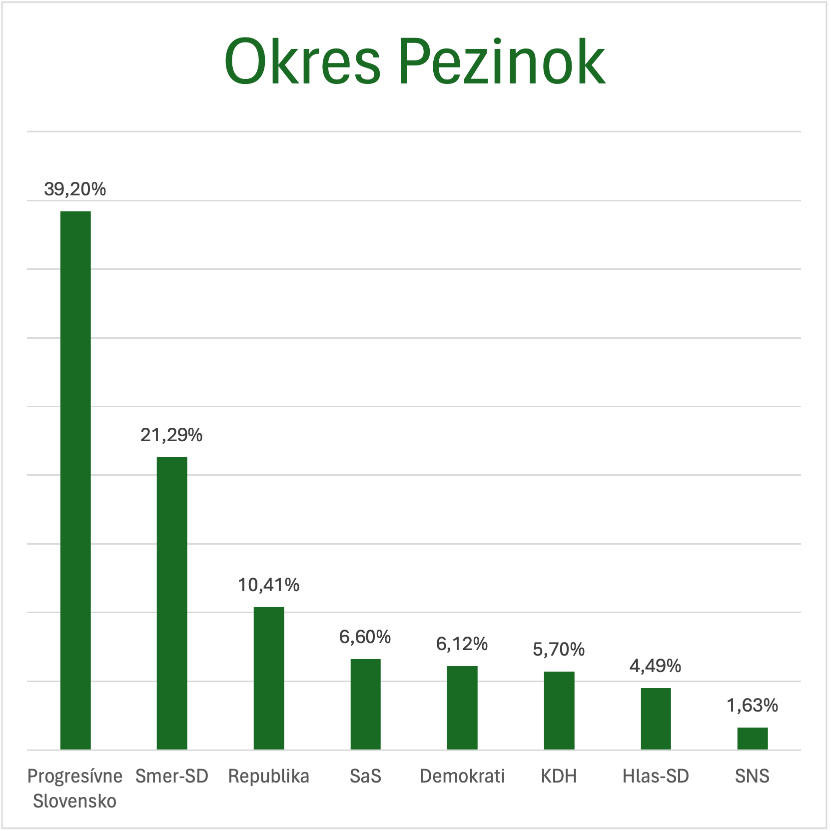 V okrese Pezinok získalo Progresívne Slovensko 39,20% hlasov, Smer-SD 21,29%, Republika 10,41%, SaS 6,60%, Demokrati 6,12%, KDH 5,70%, Hlas-SD 4,49% a SNS 1,63%.