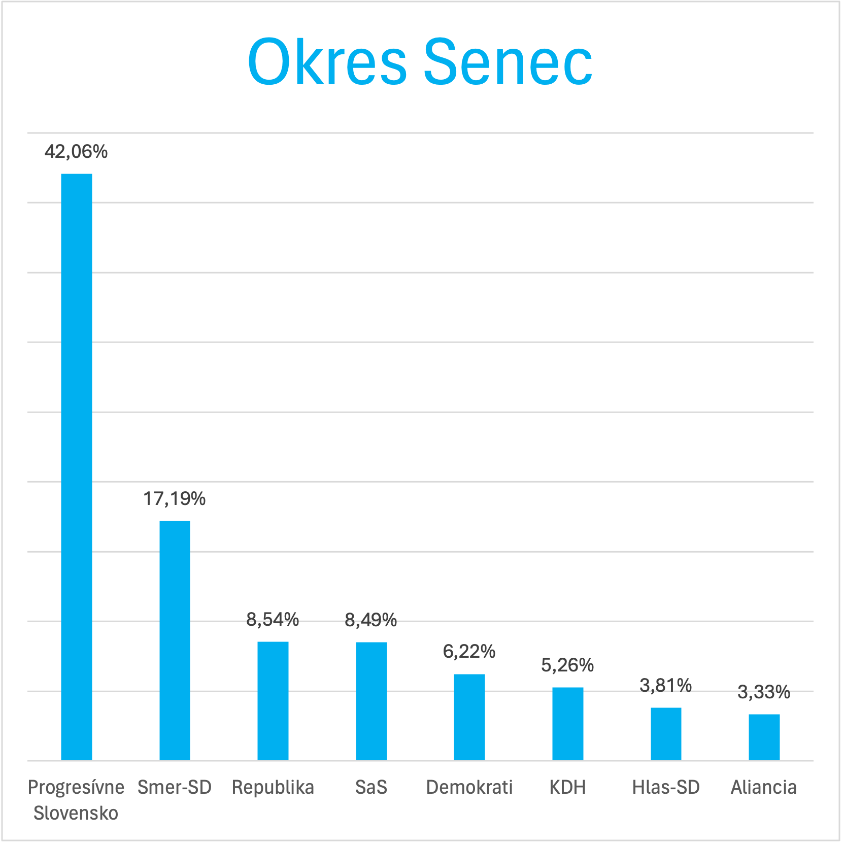 V okrese Senec získalo Progresívne Slovensko 42,06% hlasov, Smer-SD 17,19%, Republika 8,54%, SaS 8,49%, Demokrati 6,22%, KDH 5,26%, Hlas-SD 3,81% a Aliancia 3,33%.