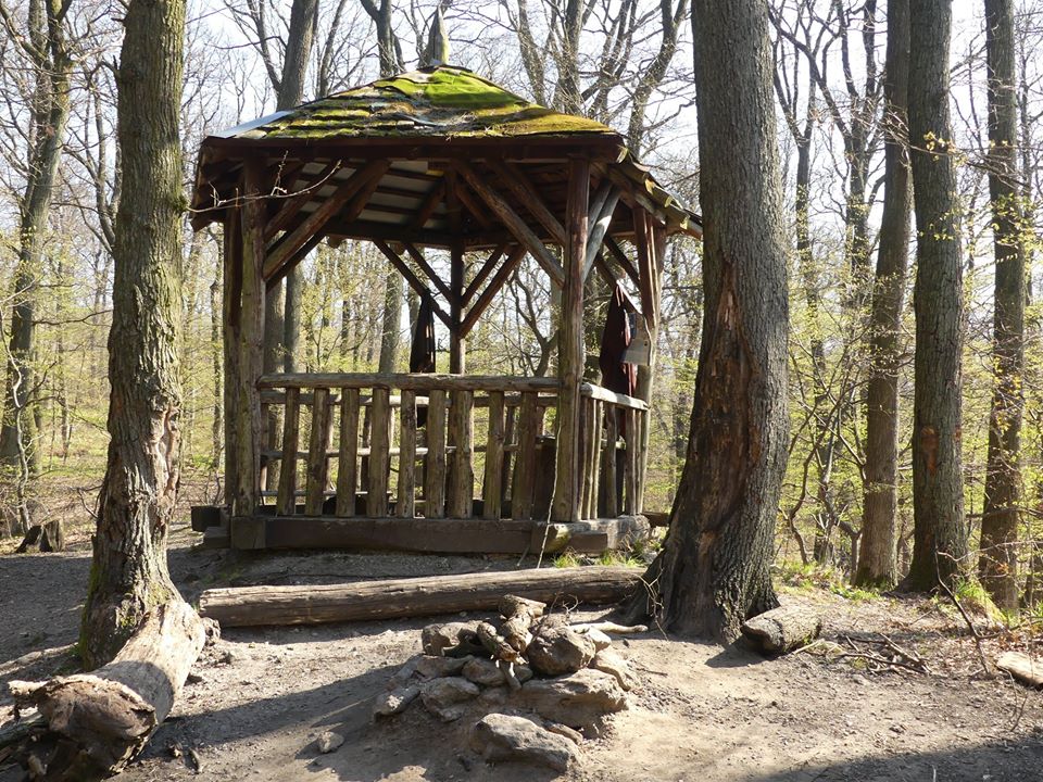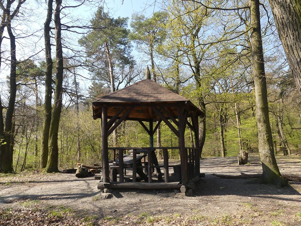 - Z Malej Bane pokračujeme po modrej turistickej značke mierne zvlneným terénom. Po chvíli budeme míňať Brichtov kríž s úsmevným textom na ňom, a neskôr sa dostaneme až na Vypálenisko, kde sa dostaneme na asfaltovú cestu. Odbočíme doľava a po červenej turistickej značke budeme asi kilometer pokračovať po asfaltke. Cesta sa nám na tomto mieste rozdeľuje, my však tu odbočíme doprava na lesnú neznačenú cestu, ktorá nás dovedie cca po 100 m k malej lúčke s prístreškom a ohniskom. Jje to vhodné miesto na príjemné posedenie, občerstvenie, či opekanie.