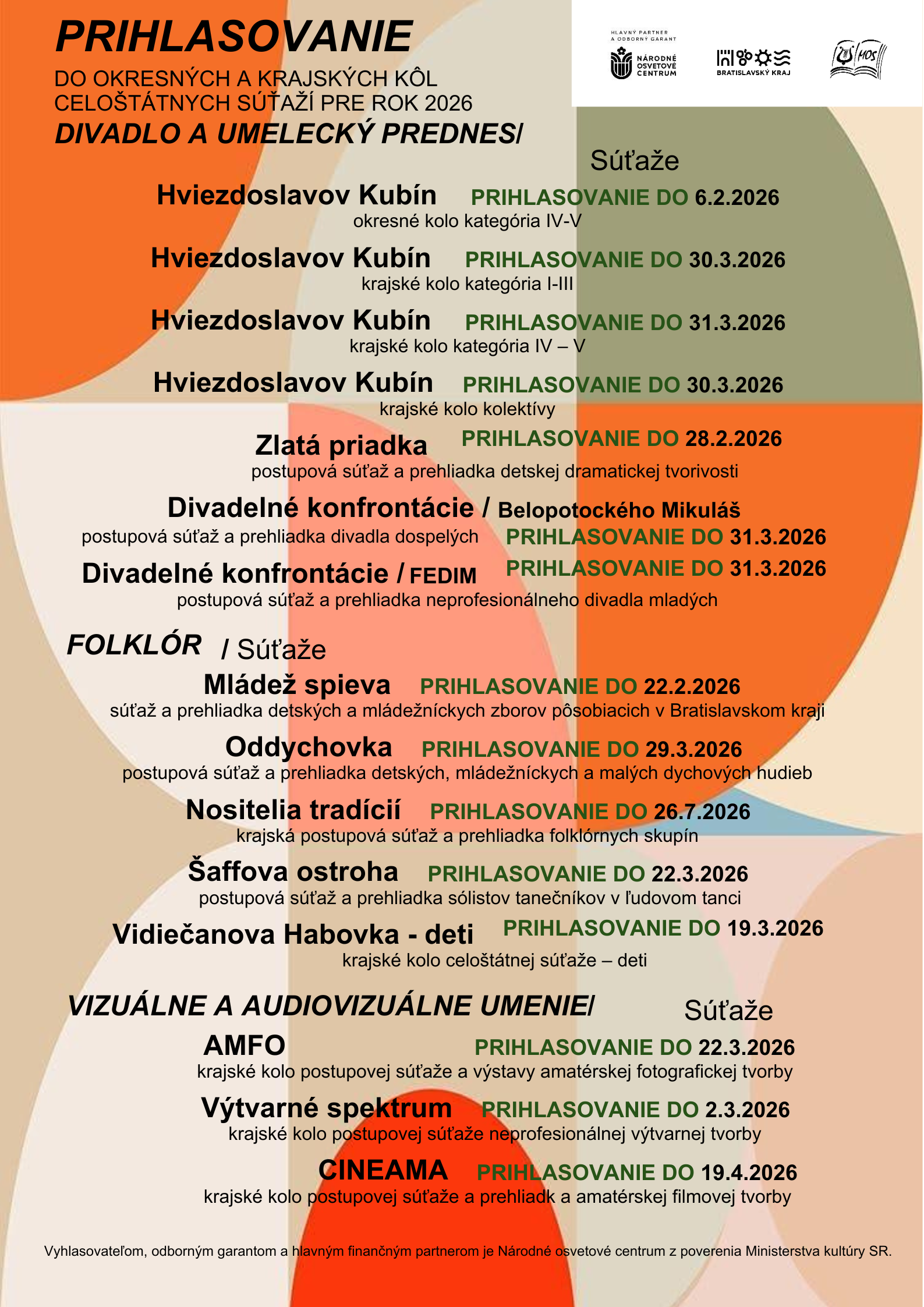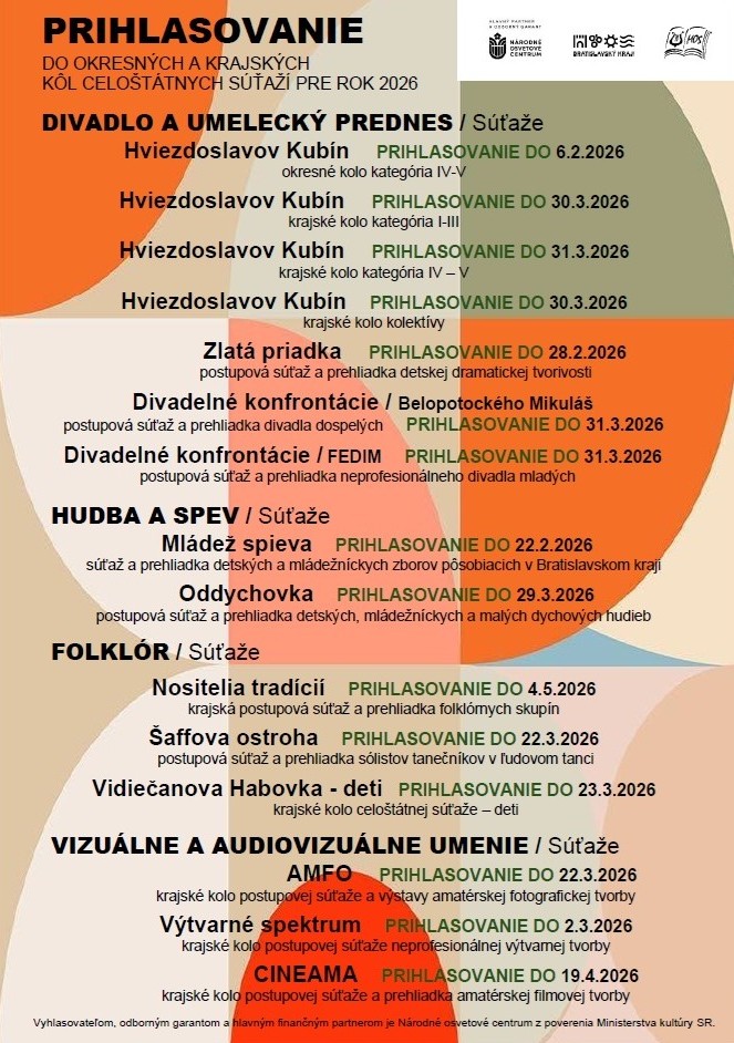 Na tejto stránke nájdete prehľad všetkých súťaží, termínov ich konania aj uzávierok prihlasovania. Podrobnejšie informácie k jednotlivým súťažiam budeme postupne zverejňovať – sledujte našu webovú stránku a sociálne siete.