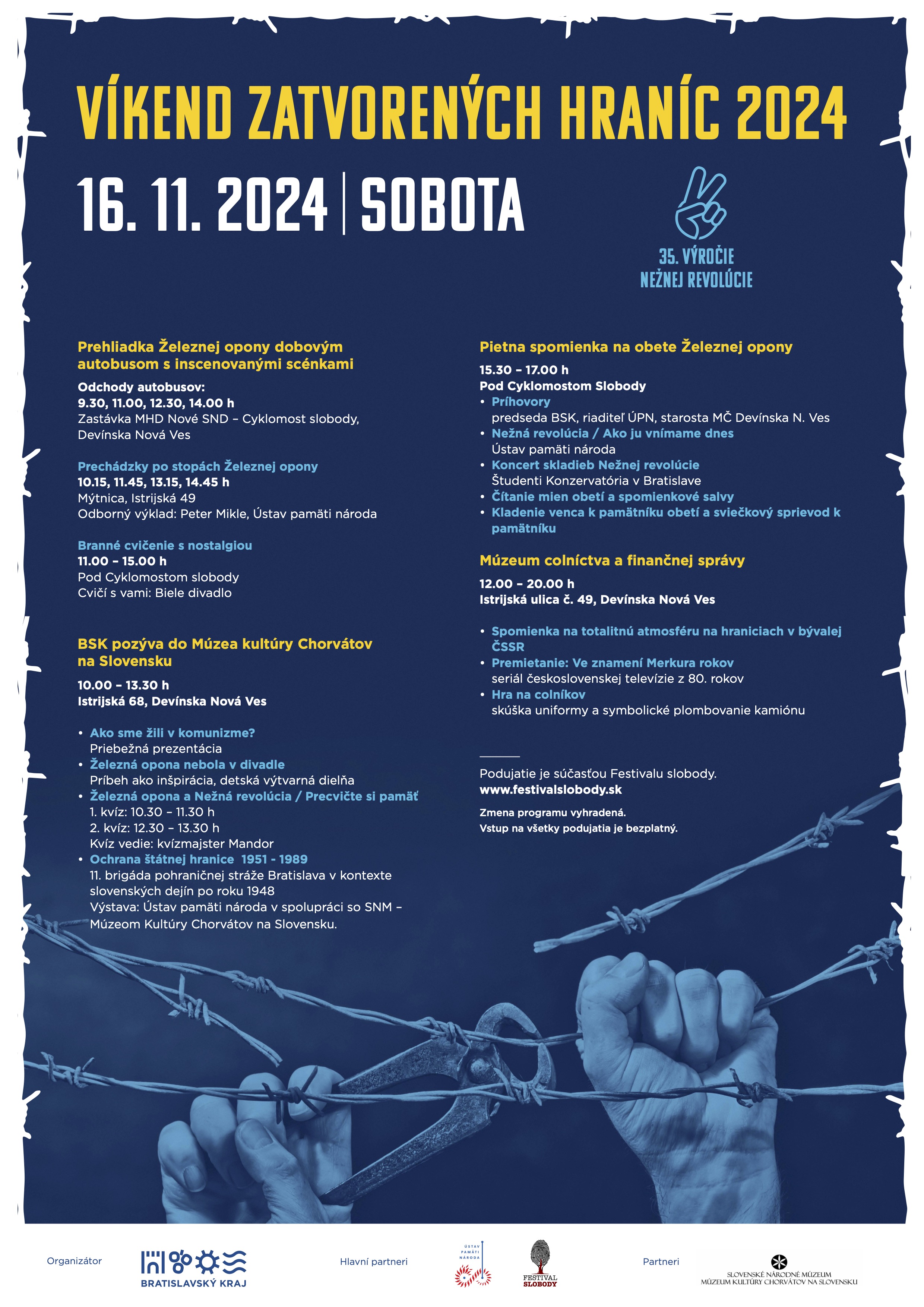 Pod Cyklomostom slobody sa môžete tešiť na branné cvičenie, a od 15:30 krátky kultúrny program s piesňami z novembra a rozhovormi. V Múzeu kultúry Chorvátov plánujeme tvorivé dielne, novembrový kvíz, otvorenie Múzea colníctva, zatvorenie mosta a pečiatkovanie výjazdných doložiek.