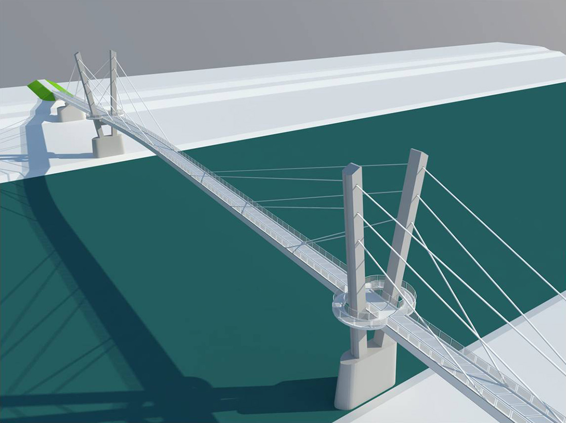 Na moste sú navrhnuté dva oceľobetónové spriahnuté pylóny výšky 43,27 m a 42,85 m. Pylóny mosta sú tvaru H so šikmými stojkami odkláňajúcimi sa od osi mosta smerom hore aj dole od priečle. Sklon je rovnobežný so sklonom stien hlavného nosníka. Na priečli je uložený hlavný nosník. Most prevádza cyklistickú komunikáciu šírky 4,0 m, celková šírka mosta je 4,9 m.